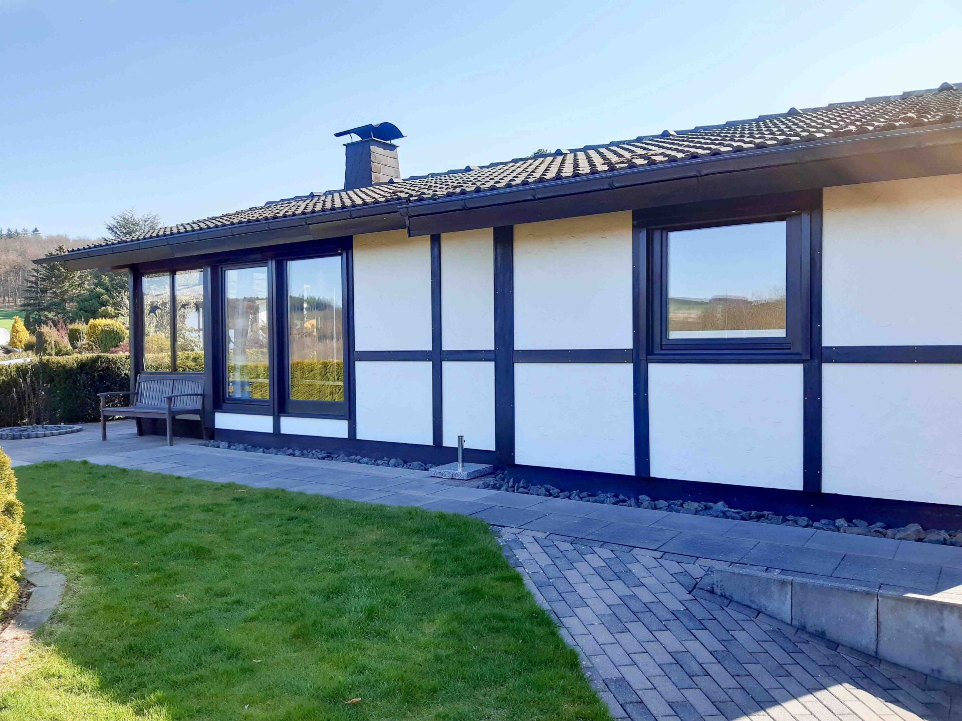 Das im sauerländischen Fachwerkstil gehaltene Ferienhaus Henneglück "2" befindet sich im Ferienpark am Südhang Hennesees in sehr