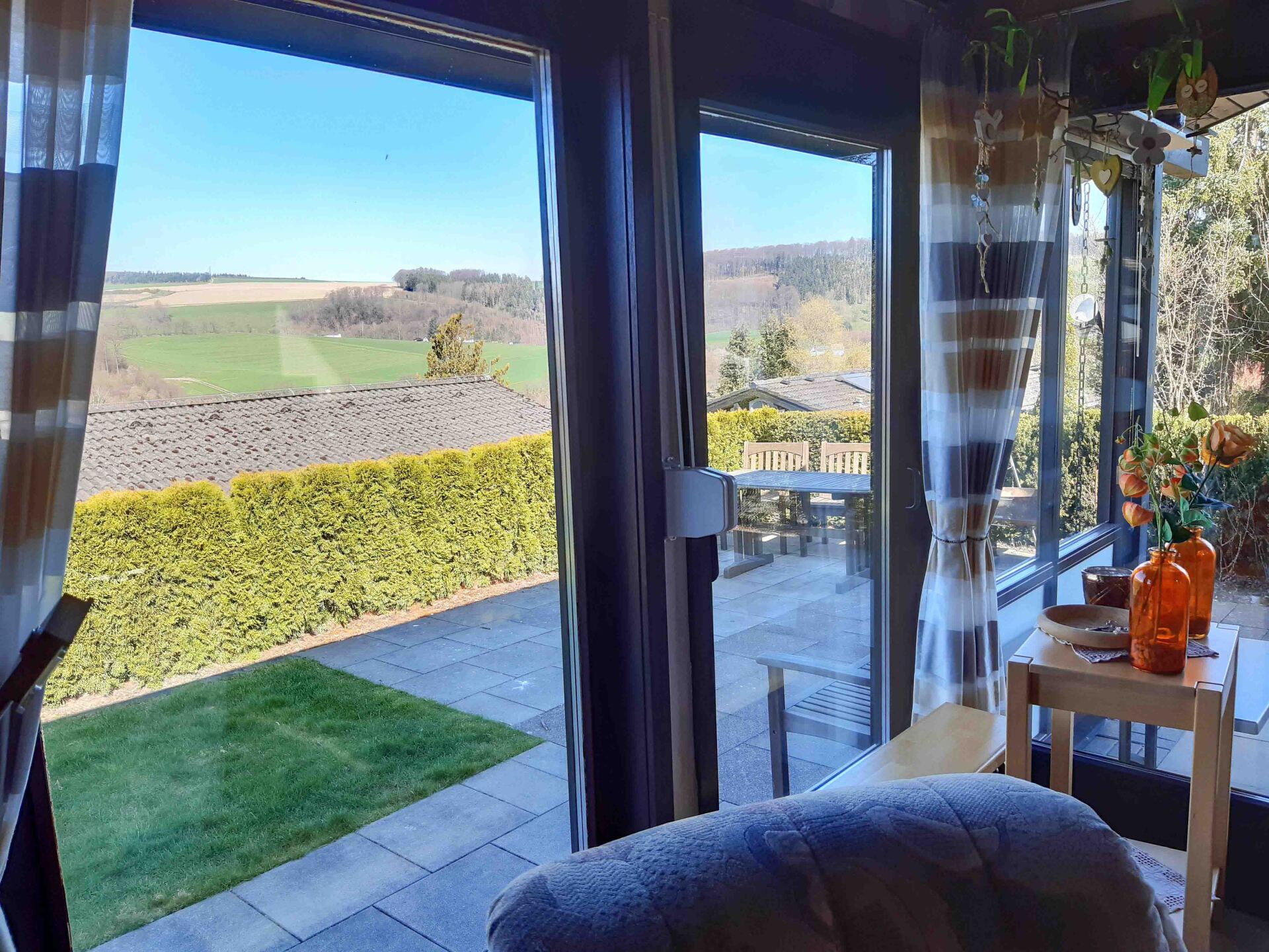 ruhiger Lage mit beeindruckender Fernsicht. Ein lichtdurchfluteter Wohn-/Essbereich mit Panoramafenster und ein Kaminofen empfangen bis zu 4 beziehungsweise 6 Gäste bei Nutzung eines seperaten Luftbetts mit wohnlicher Gemütlichkeit, in dem Sie erholsame Tage verbringen können.