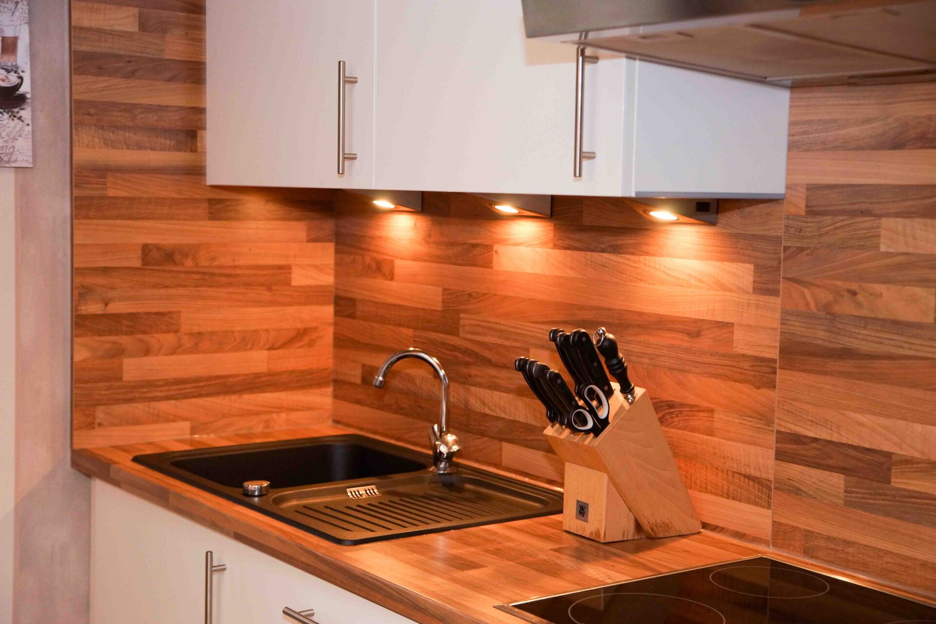 - gepflegte Küchenzeile komplett ausgestattet mit Ceranfeld, Backofen, Kaffee- und Senseomaschine, Mikrowelle, Spülmaschine umd umfangreichen Küchenutensilien wie Eierkocher, Wasserkocher, Mixer usw. ..